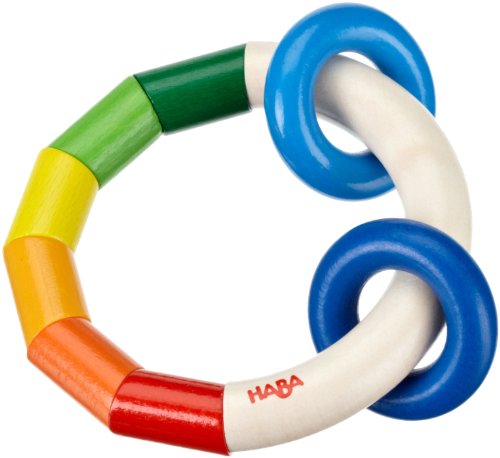The Kringelring Rattle is perfect for grasping, teething, and shaking. Made in Germany. Appropriate for 6 months plus.